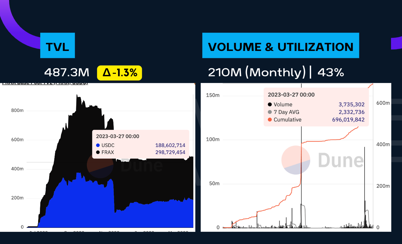 For this week we saw the FraxBP TVL dropped to $487.3M, which is -1.3% from last week.  Also, we look at the volume traded.  For context, in February we hit 49.3M, and in March we hit 210M – we gained 16M over the last week.  This represents a 43% utilization rate.  The stablecoin trading volume has been ridiculously profitable for Curve this month.
