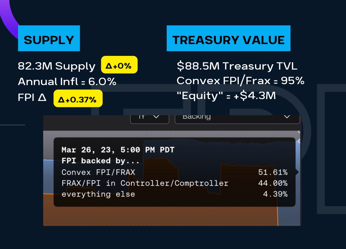 Quick refresher, FPI is a Frax Price Index, which is a stablecoin that tracks inflation.  This is the first product of its kind on chain.  Let’s run through the numbers!  So far, we have 82.3M supply of FPI, the current inflation reading is 6.0% and the FPI peg is ABOVE by 0.37% of its mandated peg.  The FPI Treasury is used to generate yield to maintain the peg.  FPI’s treasury is at $88.3M, which is comprised of FPI, FRAX, and a small percentage holding of FXS.  95% of the treasury is in the FPI/FRAX convex.  All these assets are put to work just like in the AMO to earn that needed yield to keep FPI at the inflation peg.  These assets managed to produce $4.3M above the amount needed to maintain FPI at the peg, therefore we have what we like to call “equity” for the veFPIS of $4.3M.