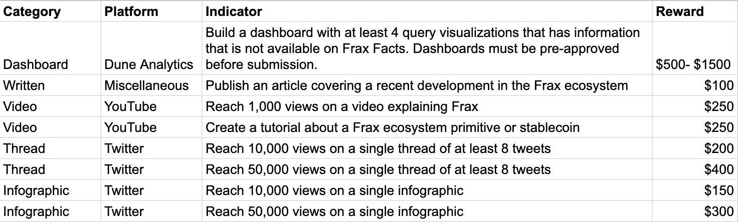After a successful first quarter proliferating Frax content and educating the wider crypto community about Frax, the Frax Ecosystem Educational Incentives was approved to be extended by another six months! Along with the extension, several amendments were made to the program such as increasing the payout to from $10k to $12k a month and modifying the payouts into the following categories: