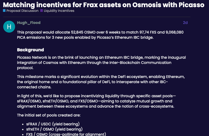 This proposal will match incentives for Frax assets on Osmosis with Picasso, allocating 52,845 OSMO over six weeks to match 97,740 FXS and 9,068,080 PICA emissions for three new pools enabled by Picasso's Ethereum IBC bridge. This collaboration will kickstart the integration of Cosmos with Frax. In total the LP incentives total $1m.