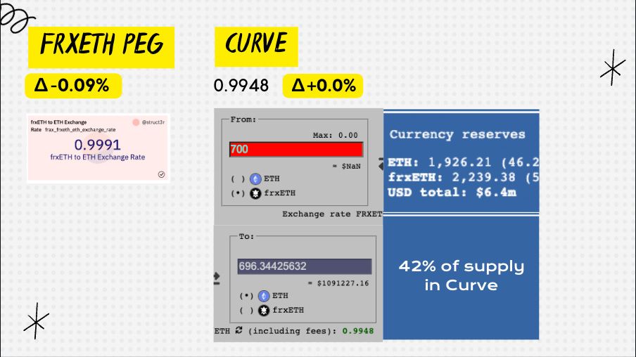 As always, we check the peg.  But before that, quick shoutout to the homie Struct3r who built this dashboard.  Frax community is the coolest.  Join us in telegram @flywheelpod on telegram.  So let’s dive in.  Peg check here is strong you see the price delta is only 9 bps between frxETH and ETH.  We obvs have to go into the market and check this ourselves and you see here that I tried to do a 700 ETH swap which is about $1M and I get an exchange rate of 0.9948.  That’s pretty dam good.  Also, last week we had 12.5% of the frxETH staked in the Curve pool, and now we have FORTY-TWO % of the supply inside curve.  Let’s see what the count looks like this week.