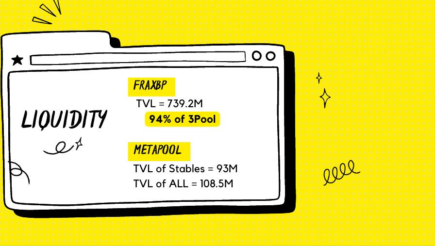 Summary time.  Liquidity Check.  FraxBP is 739M which is 94% of 3Pool.  The MetaPool is at $93M for stable pairs, marking a 7% decrease over last week.  And TVL of All pairs (stables + non-stables) are at $108.5M.