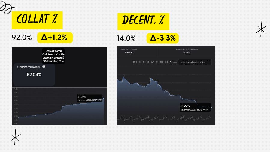 This is the % that conveys how much FXS (algorithmic) is used as collateral.  I want to highlight the collateral ratio for the OUTSTANDING FRAX aka non-Frax controlled.  A reminder, Frax protocol owns a lot of its own FRAX and theoretically, Frax won’t ever redeem its own underlying collateral backing so the only real collateral ratio we should monitor is that of the OUTSTANDING FRAX, which currently sits at 92.0%.  Following we have the Decent %.  We are at an ATL of 14.0%.  V v v v much bear market vibes across the board when it comes to these two metrics.  We want to see the Collat % going back to the low 80s and the Decent % going back to 30s.