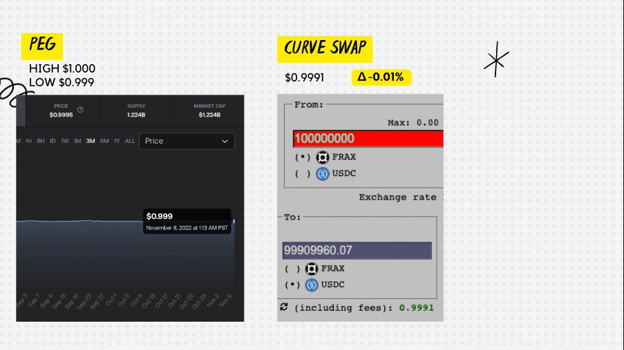 Let's begin our regular programming with the Peg.  We saw it get as low as $0.999 with a high of $1.000 for the week.  Peg Check = Strong.   We then looked at Curve via swapping 100M FRAX for USDC.  We switched it up since the FraxBP is now larger than the Frax3CRV.  We received a 0.9991 exchange rate, which is pretty much unchanged compared to last week’s.  Moving on we have our Collateralization %.