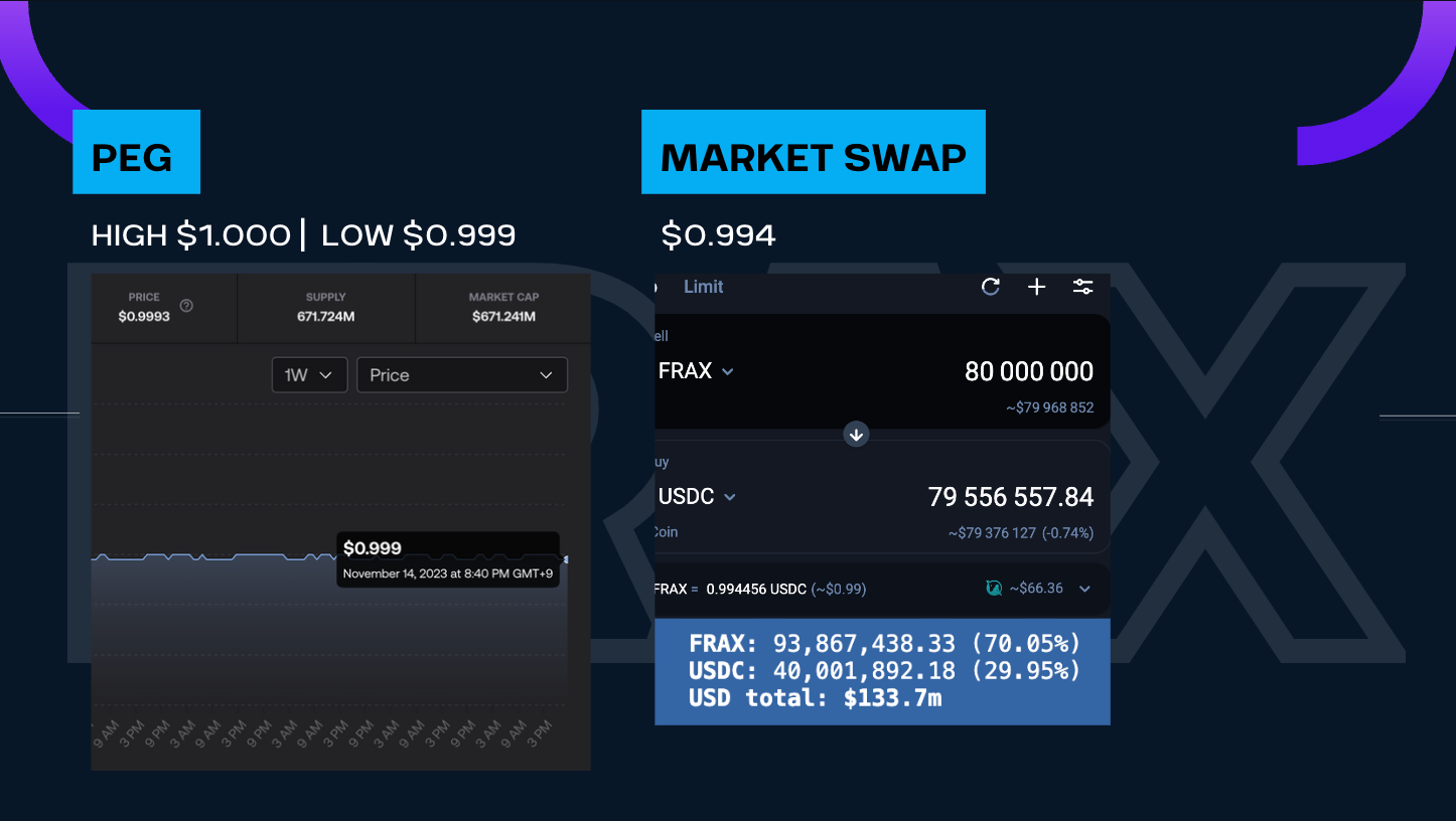 We saw the peg got as high as 1.000 and as low as 0.999. In the market, we saw an exchange rate of $0.994 when swapping up to 80M of FRAX for USDC. We're having to reduce the total size of our swap from 100M FRAX to 80M FRAX since the FraxBP is getting imbalanced again.