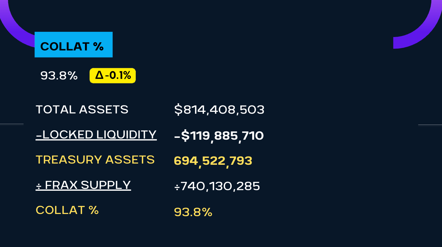 The Collateralization Percentage dropped by 10 basis points up to 93.8%. We got this number by taking the Total Assets ($814M) subtracting the Locked Liquidity ($120M) then dividing that by the Total Frax Supply (740M).