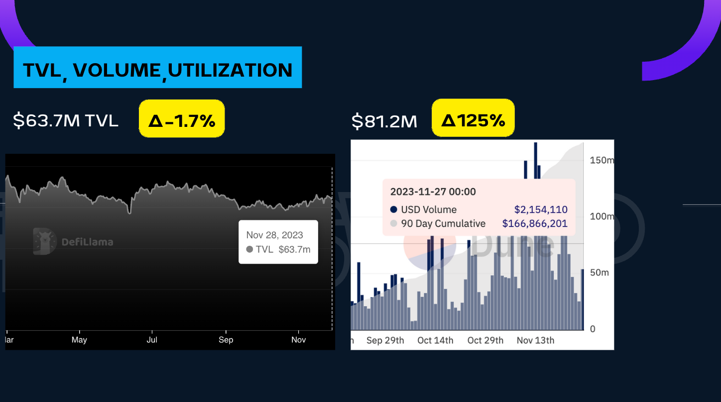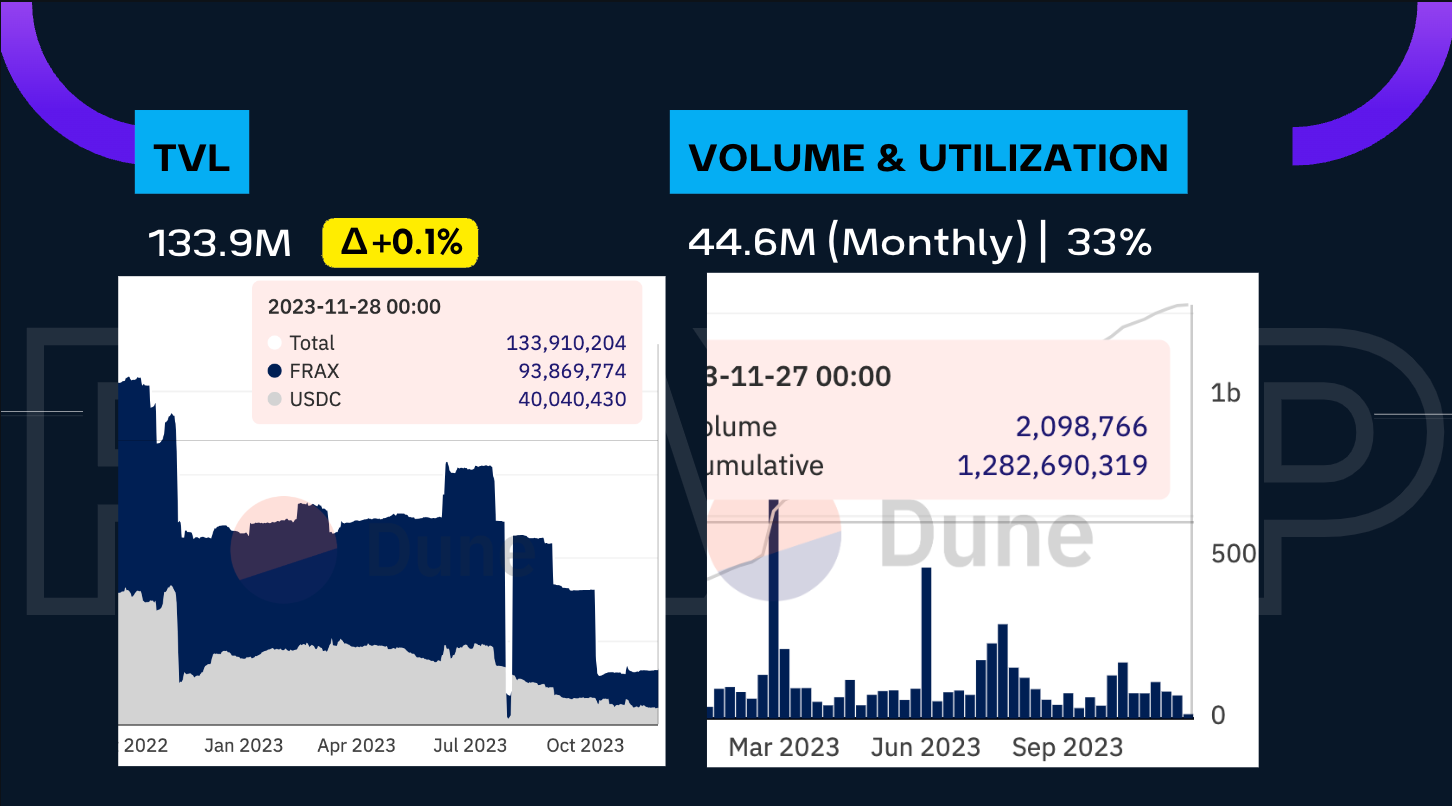 Lastly, we have the final leg of the DeFi Trinity with FraxSwap. We like to call this the Dex that no one talks or knows about. There are only $63.7M TVL across all the pools. For October, this DEX turned over 73% of its TVL. But in November, it facilitated 125%.