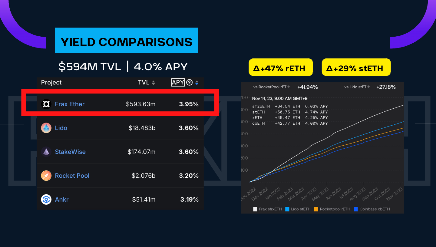 In the yield department, frxETH leads the pack with 4.0%. The competitors are closely behind though so there is no resting!