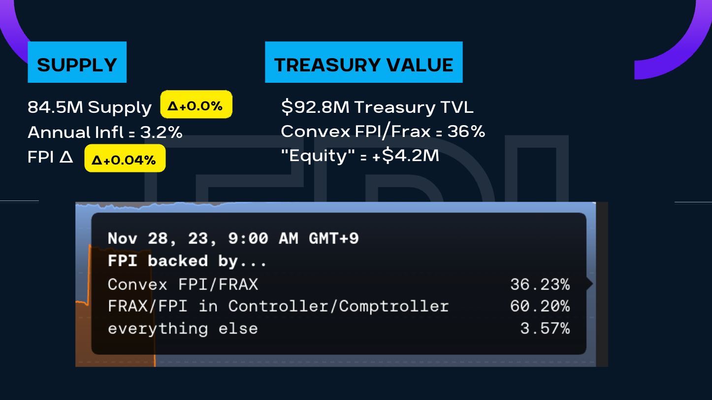 The final stablecoin: FPI. The Annual Inflation Index dropped by 0.5% and is now at 3.2%. Good thing that the FPI is still above Peg by 4 basis points. The treasury consists of $92.8M with an excess equity of $4.2M.