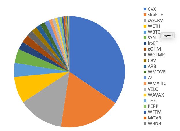 Digging deeper into the Owned Volatile assets, Frax directly owns gOHM, SYN, ARB, MOVR, ZZ, GLMR, MATIC, VELO, AVAX, THE, PERP, FTM, BNB, SDT, TOKE, ENS, CHR, OP and MULTI. A very robust portfolio of DeFi assets.