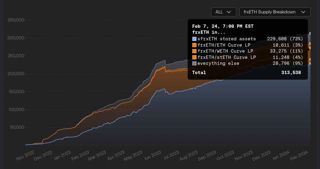 Up until now, the only sink for frxETH was liquidity. Frax only supports FXS gauge rewards for frxETH. Users had to choose whether to stake sfrxETH and earn ETH rewards or provide liquidity with frxETH on Curve or one of the other DEX's and earn FXS, CRV, CVX, or other reward tokens. In the chart above from Frax Facts, you can see the current split of tokens between sfrxETH and frxETH. As of writing, 73% is staked as sfrxETH earning ETH rewards and the other 27% is used for liquidity. The split gives sfrxETH a 36% bump in reward yield as a result.
