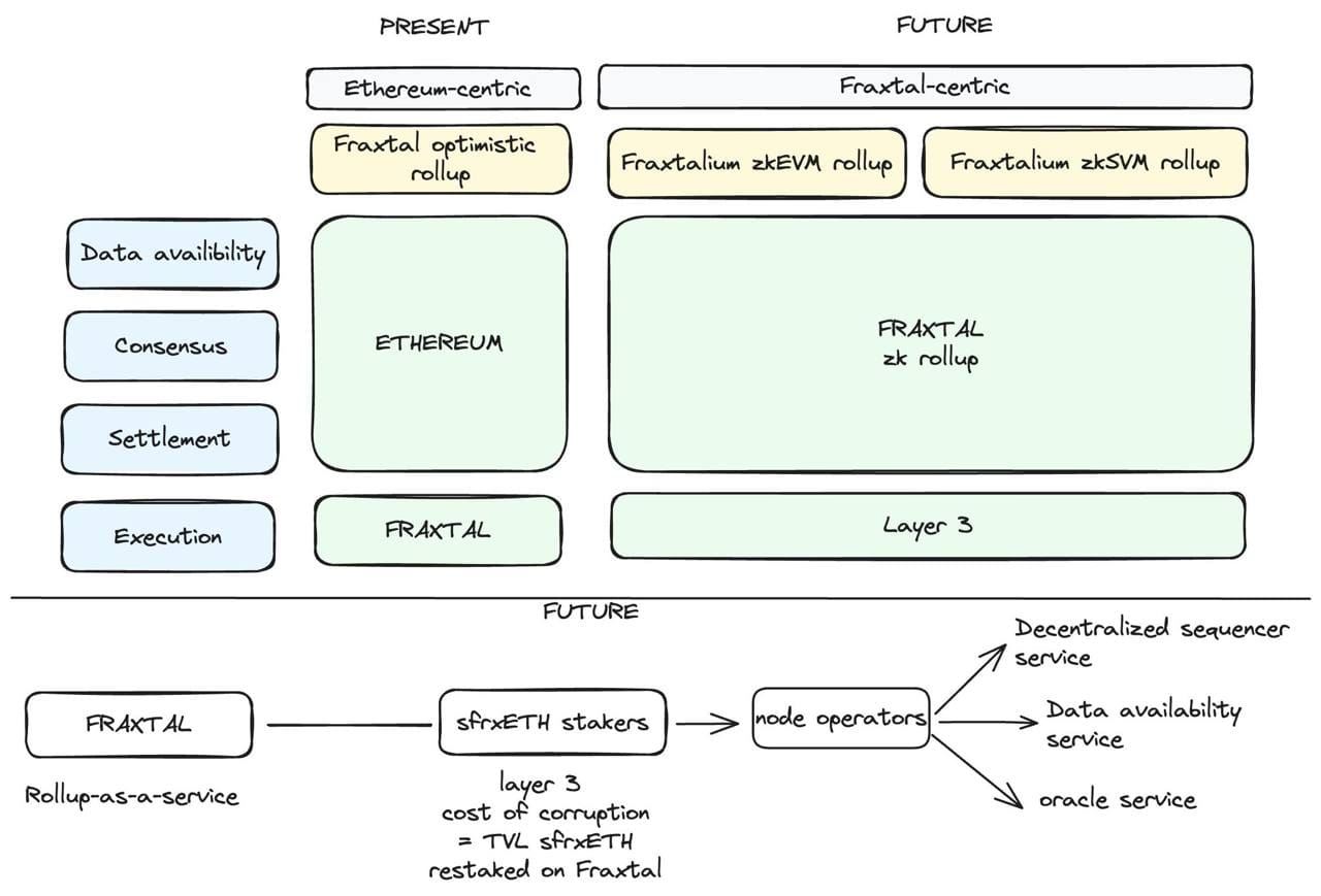 Furthermore, Fraxtal is modular, meaning its consensus, settlement, execution and data availability are broken into separate modules. This allows for improved future scalability, massive potential innovation in the future, and flexibility. Already Fraxtal is using an internally developed data availability layer developed by the Frax Core Team. Fraxtal's modular design will enable middleware and other components from other networks to easily integrate to connect and deploy L3s on top of Fraxtal.