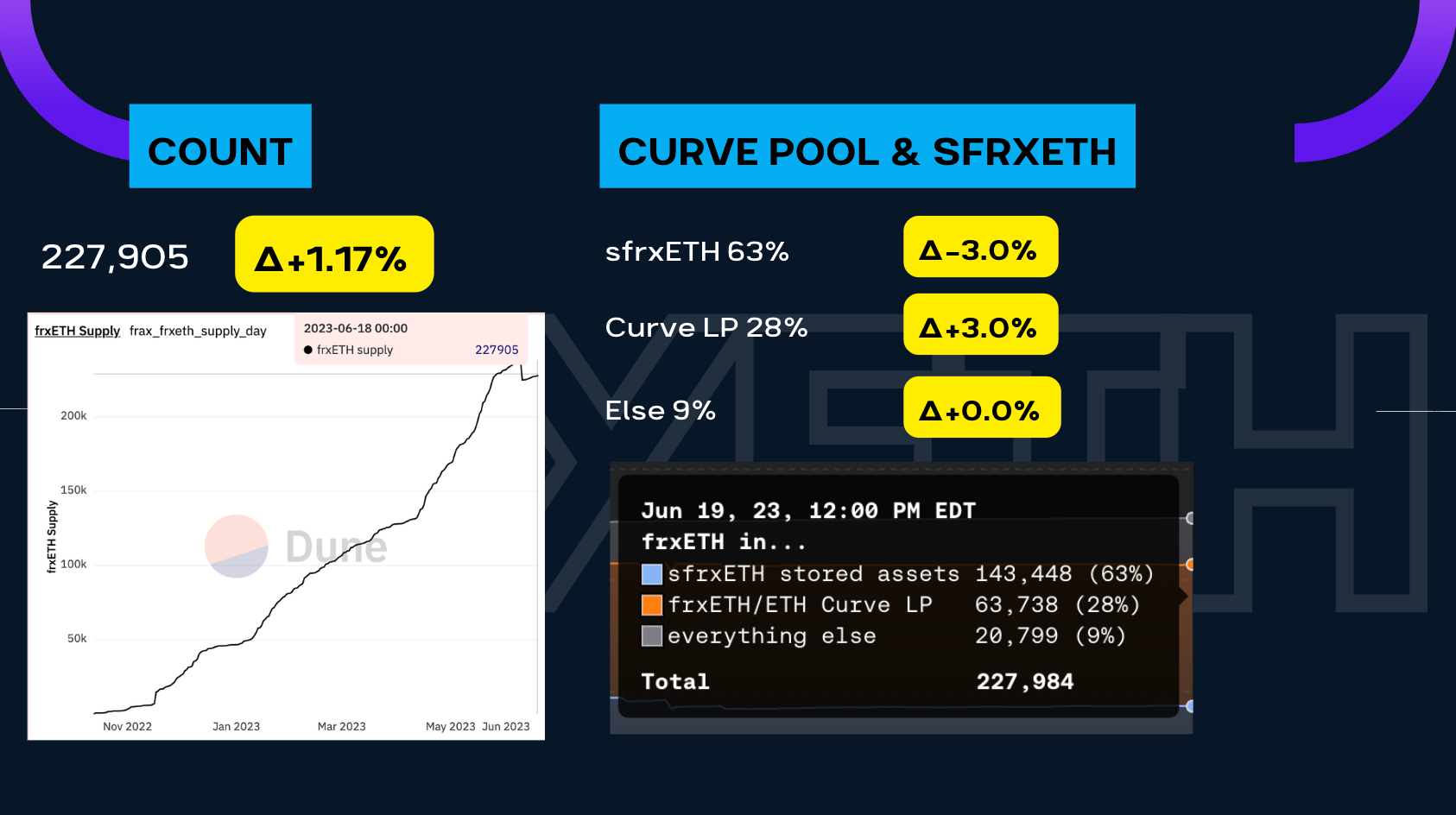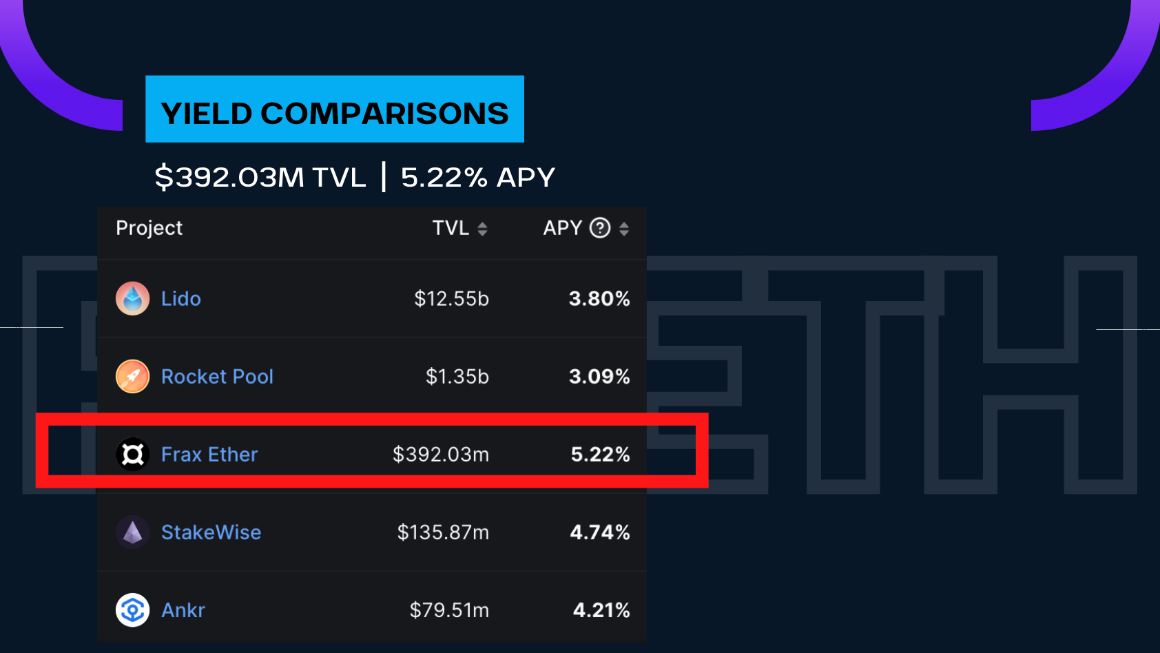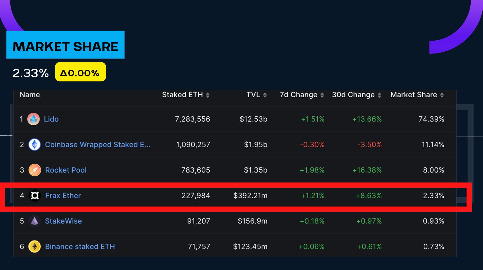 This week we were not only able to maintain our position in 4th but also our market share of 2.33%. Showing us that perhaps we may not be going down again, especially with the highly anticipated frxETH v2. June has been a slow month but hope is not lost. As we stay strong, frxETH continues to be in the middle of the contenders this week in the yield arena due to the drop in TVL. Though, frxETH persevered to once again lead the pack in APYs at a rate of 5.22%! The validators have been deployed!