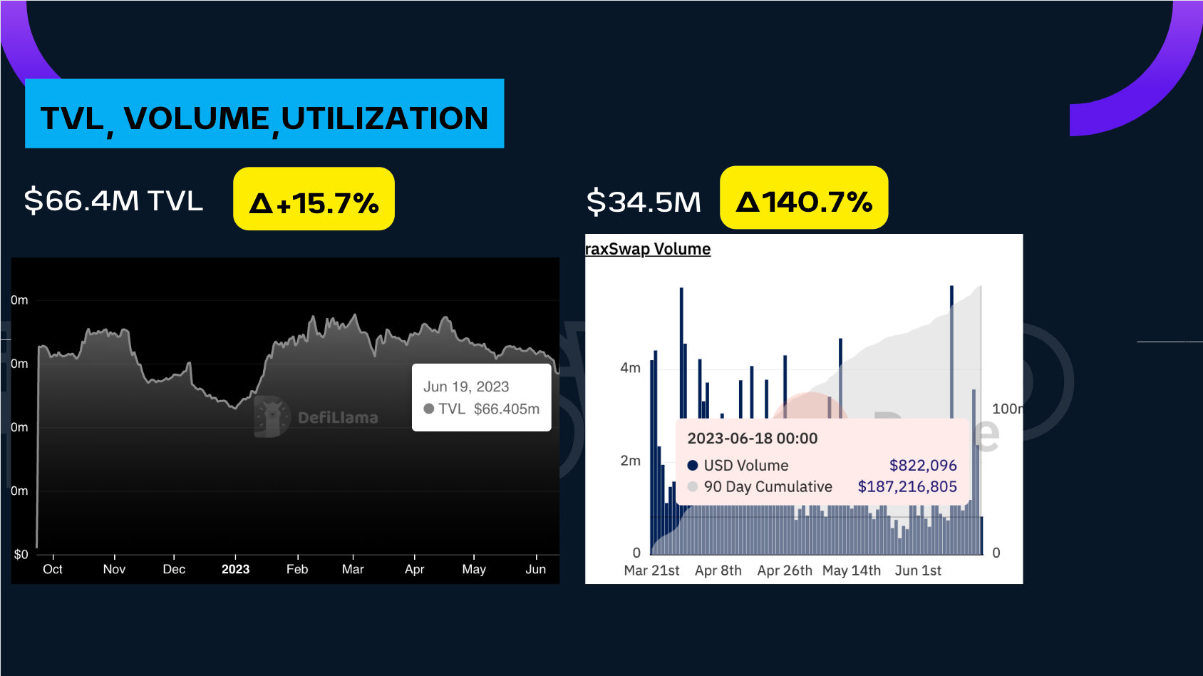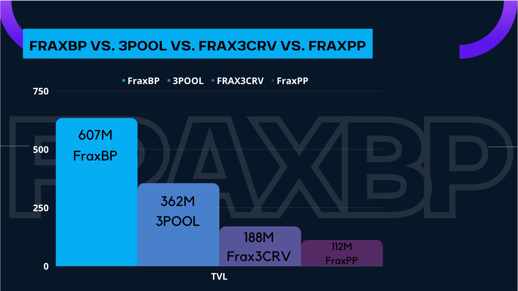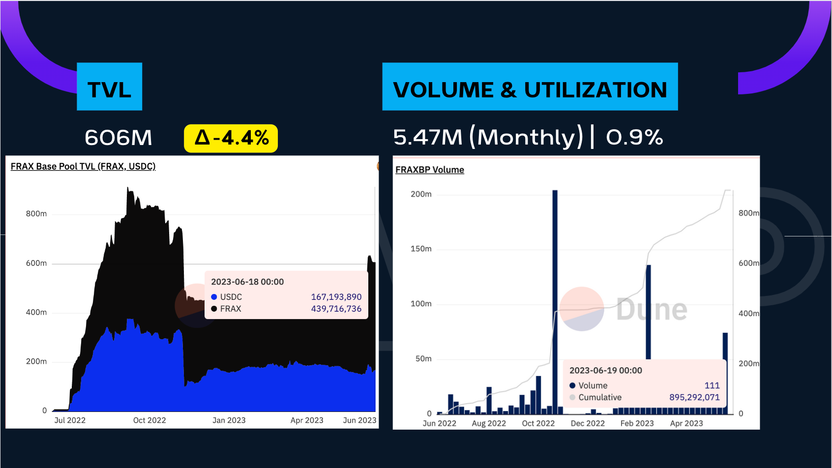 We had some ups and a significant hit this week…  FraxBP’s TVL dropped by $28M (4.4%) down to 606M. The monthly volume dropped by 9.73M and utilization to 0.9%.   From the last week’s 134M jump, FraxBP seems to be having a little correction. Frax liquidity pools have maintained their strong leading positions amidst the drop in TVL. Even under pressure, the FraxBP asserts its dominance.