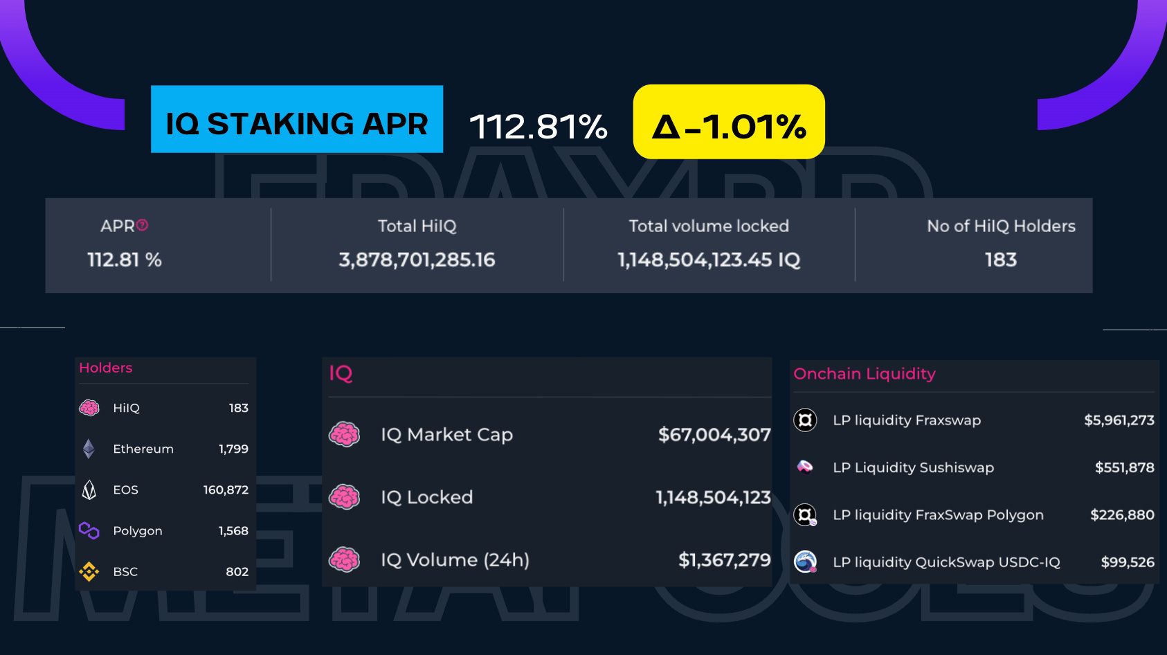 Additionally, you can stake IQ today to earn a mighty 112%. There are 1799 holders of IQ on Ethereum but only 183 are staked. There’s definite value in staking as the treasury is $13.6M. There needs more governance power to secure and direct the treasury.