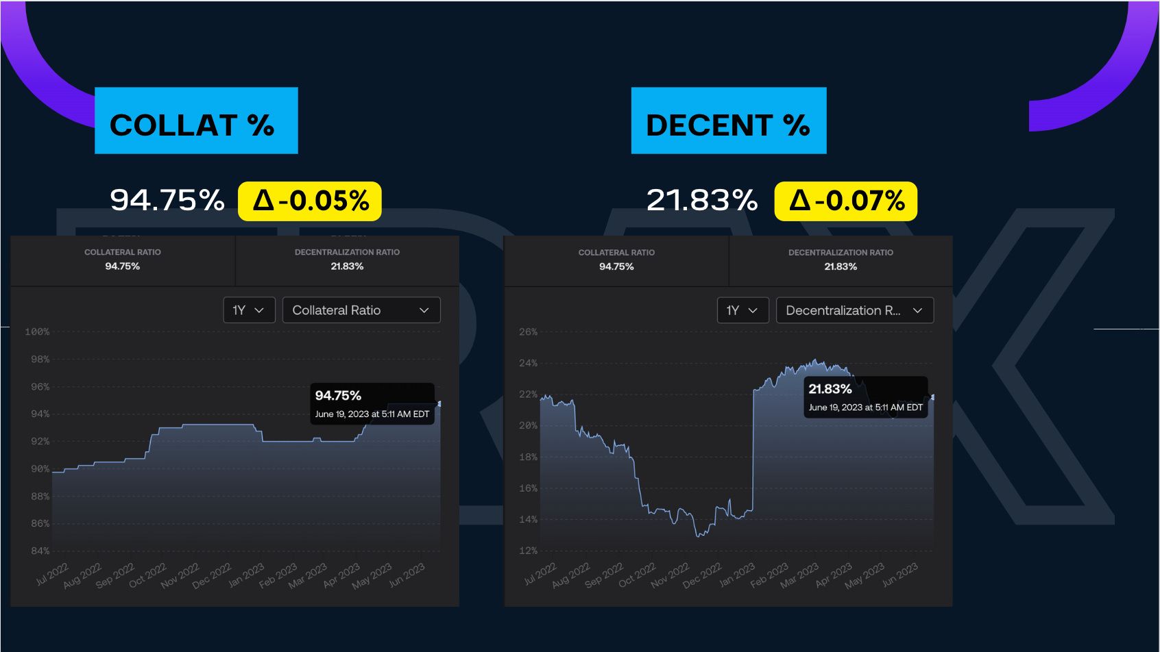 The Frax supply continues to remain flat, the peg range is staying stable but, the Curve swap exchange rate has increased to $0.9975 from last week's $0.9974. As we always say we do not like to see the number 7. Aside from that, not much more to report here so let’s move on to the Collateralization and Decentralization Percent.