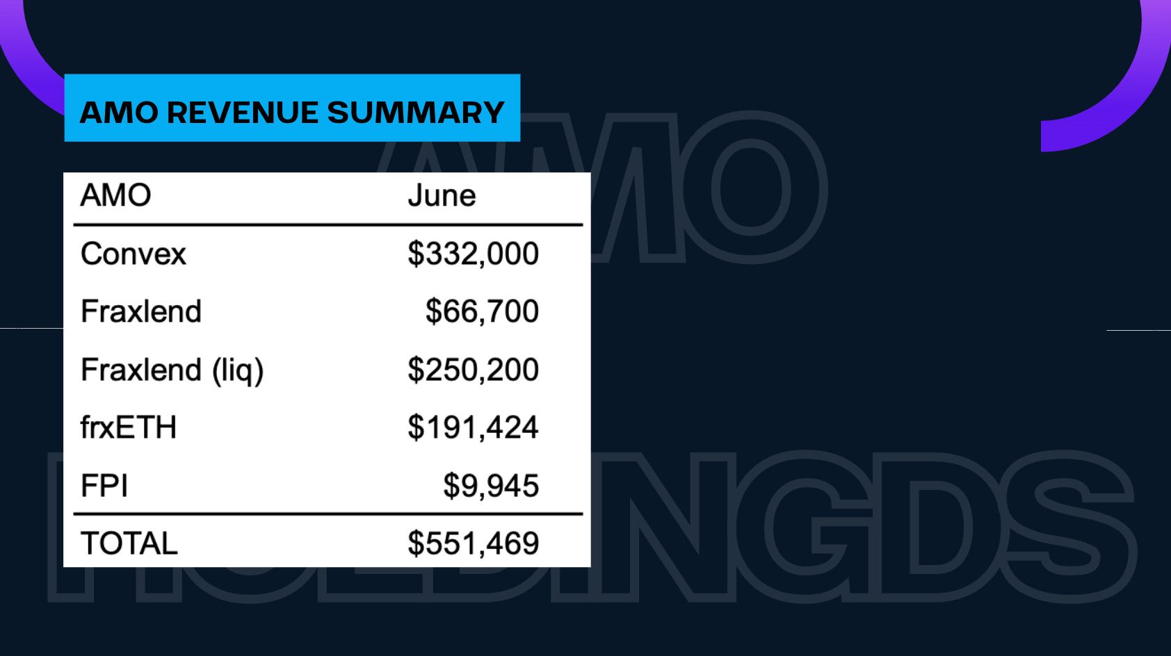 With two weeks left, June has proven to be quite an exciting month so far. We have seen a $246k increase since last week, generating a total of $551k in revenue and only $76k in expenses. The Convex AMO redeemed itself generating $396k, more than triple the loss of last week! With FraxLend, we generated an extra $22.7k bringing us to $66.7k