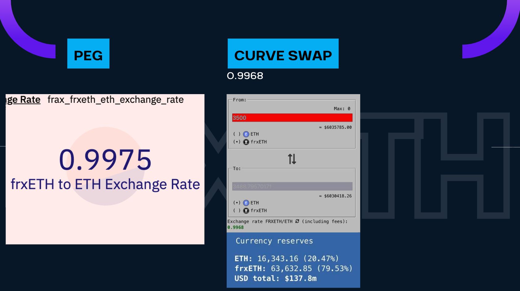 We’ve said it before and we’ll say it again frxETH is a stablecoin, just like any stablecoin except pegged to ETH instead of the dollar. So let’s check out the peg. The dashboard above shows 0.9975,  although we do not like having the number 7 it’s still a strong rate. We know better than to just rely on dashboards so let’s check the market rate. We swapped 3.5k frxETH for ETH via Curve and received an exchange of 0.9968 — yikes… We continue to slowly decline and bleed even after the reduction of frxETH from the Curve pool.