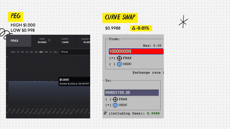 Let's begin our regular programming with the Peg.  We saw it get as low as $0.998 with a high of $1.000 for the week.  Peg Check = Strong.   We then took a look at Curve via swapping 100M FRAX for USDC.  We switched it up since the FraxBP is now larger than the Frax3CRV.  We received a 0.9988 exchange rate, which is pretty much unchanged compared to last week’s but still better than the Frax3CRV pool.  Moving on we have our Collateralization %.