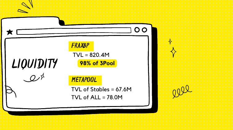 Summary time.  Liquidity Check.  FraxBP is 820M which is 98% of 3Pool.  The MetaPool is at $67.6M for stable pairs, marking a 7% increase over last week.  And TVL of All pairs (stables + non-stables) are at $78M.