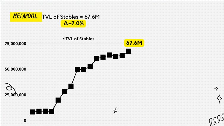Then let's transition over to the Metapools!  Reminder the metapool are pools that are PAIRED with the BasedPool, examples like LUSD/FraxBP.  I told yall to stay focus and this is what we should pay extra attention to.  The Metapools just hit a new ATH of $67.6M, a 7% increase WoW.  We’re holding firmly above $60M for the last 6 weeks.  Let’s see if we can keep this going.  Any projects out there looking to work with the Metapool, please join the Flywheel pod TG chat and DM any of the hosts for assistance.