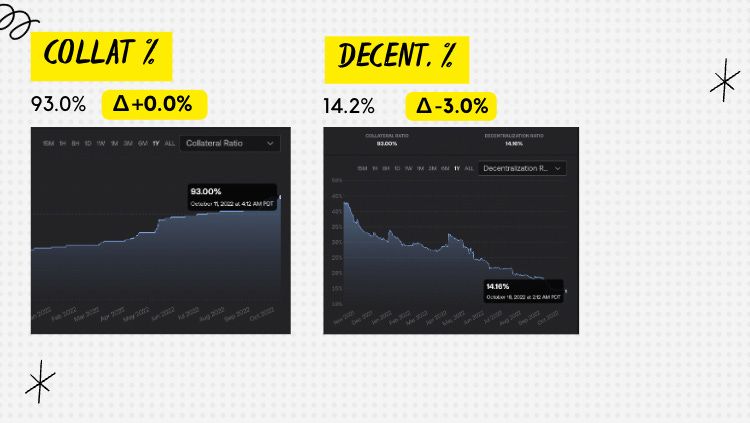 This is the % that conveys how much FXS (algorithmic) is used as collateral.  With the market bouncing around like it is, it’s expected that the collat % remain high because of the uncertainty and this week we stayed at the ATH level of 93.0%.  Following we have the Decent %.  We saw a new ATL of 14.2%, which is a 3.0% decrease from 14.6%.  So, don’t be distracted by the price chart that’s going up and to the right, it is still v much bear market vibes across the board when it comes to these two metrics.  We want to see the Collat % going back to the low 80s and the Decent % going back to 30s.