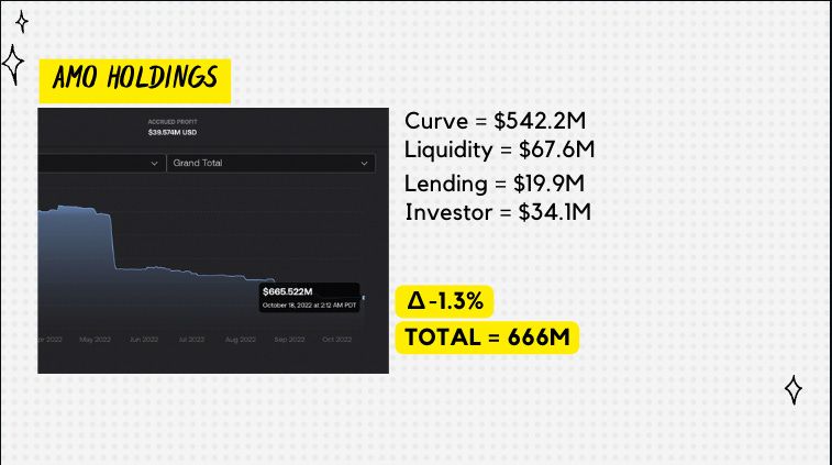 Let's jump into the AMO Holdings.  We have a grand total of $666M across all the AMOs.  This was a decrease of 1.3% compared to last week.  Not too big of a dump but this week’s drop is attributable to Liquidity AMO which dropped a hot $10M.  This is the AMO that manages Frax, FXS liquidity across the Uniswap, Sushiswap, Fraxswap, etc.  And the Curve AMO has remained flat for the last 2-3 weeks so not great.