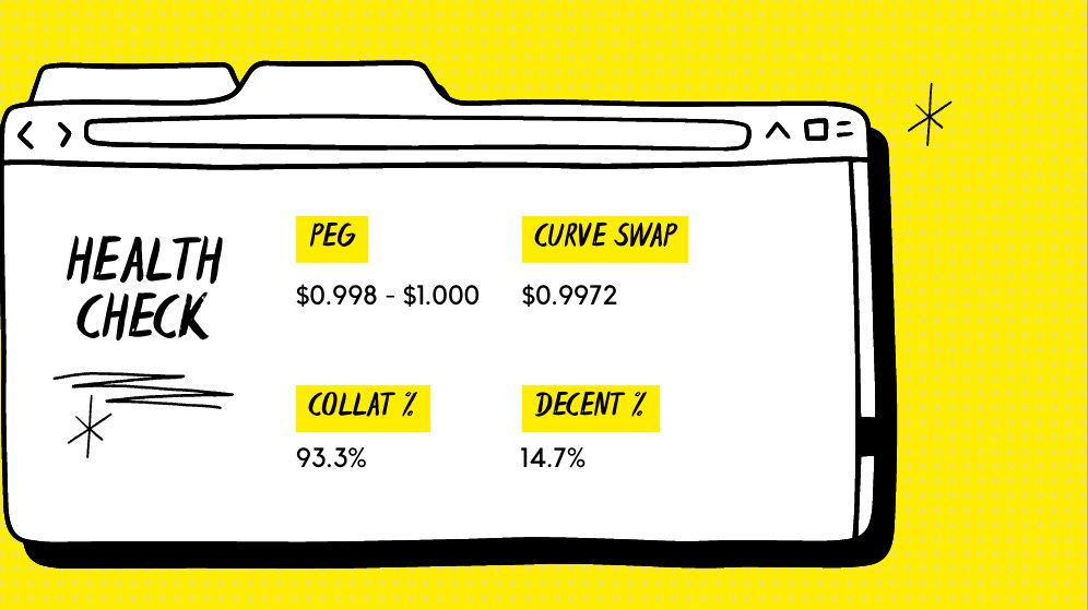 Okay.  Quick summary Health Check.  Peg Good.  Curve Swap much better this week.  Collat % could be better.  Decent % bounce from ATL.
