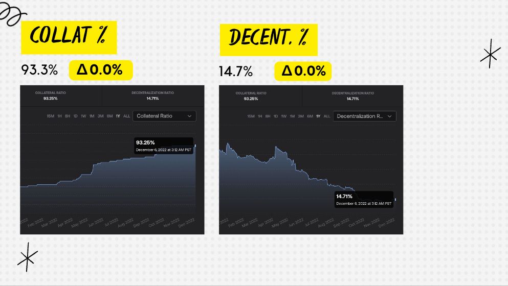 This is the % that conveys how much FXS (algorithmic) is used as collateral.  We are unchanged over the week at 93.3%.  Following we have the Decent %.  We bounced off of the lows and have remained unchanged the 14.7%.  We’re definitely in the low range but I hope I didn’t jinx us by just saying that.  V v v v much bear market vibes across the board when it comes to these two metrics.  We want to see the Collat % going back to the low 80s and the Decent % going back to 30s.