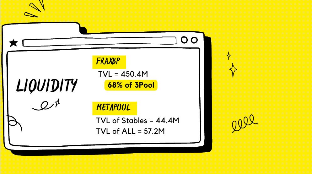 Summary time.  Liquidity Check.  FraxBP is 450.4M which is 68% of 3Pool.  The MetaPool is at $44M for stable pairs.  And TVL of All pairs (stables + non-stables) are at $57.2M.