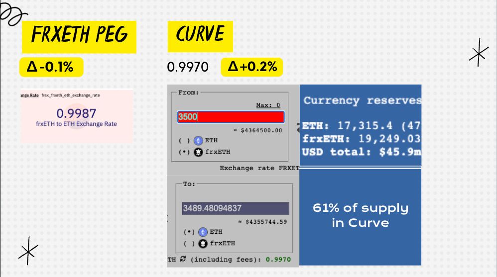 Next, we have our new segment of the check where we look at FrxETH.  As always, we check the peg.  Peg check here is strong you see the price delta is only 0.0013 between frxETH and ETH.  We obvs have to go into the market and check this ourselves and you see here that I tried to do a 3500 ETH swap which is roughly the amount of the largest frxETH holder and I get an exchange rate of 0.9970.  That’s not too bad.  Also, last week we had 66% of the frxETH staked in the Curve pool, and now we have 61% of the supply inside curve.  The APY as per Convex is at 10% projected.  Littttt.  That’s why everyone is here.  Let’s see what the count looks like this week.