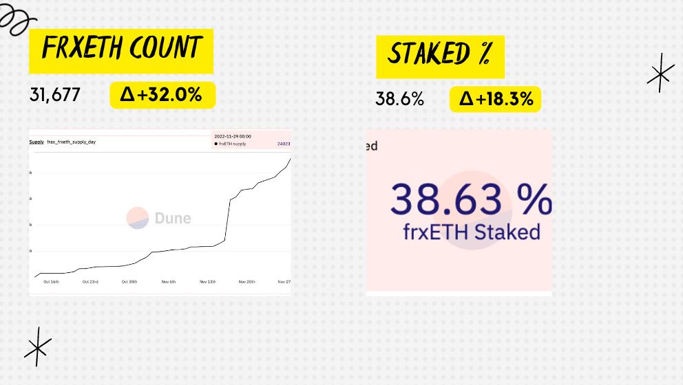 The count is at 31,677.  And look at that chart, I know you can’t read it but just appreciate the verticalness off that graph.  +32%.  Hot.  On the staked side we see that 39% of all the frxETH is being staked to earn the ETH native staking rewards, which is 5-7% but since only about 40% frxETH is staked, sfrxETH stakers get a boost in their staking rewards.  Let’s do a quick summary check.