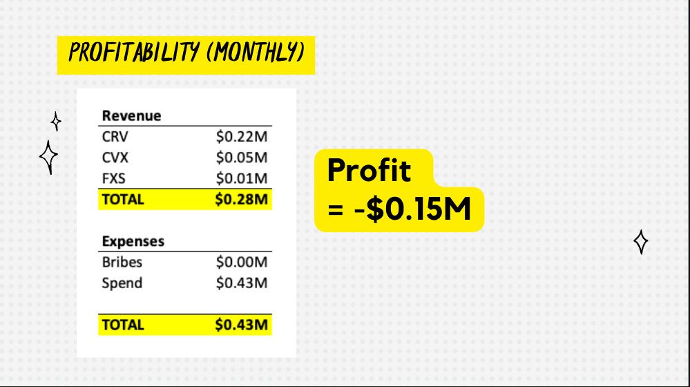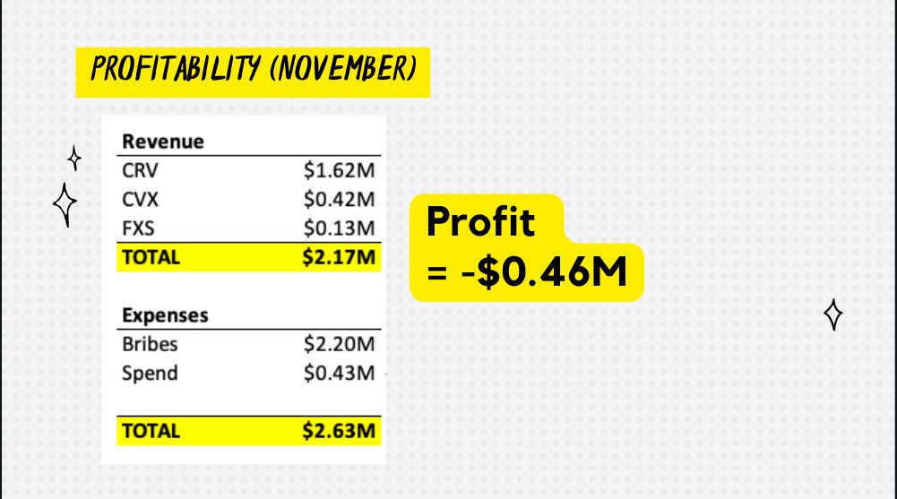 Onto the profitability of the Convex AMO.  We’re now at $2.17M in Revenue for the month of November.  We paid roughly $2.2M in bribes so far plus about $430k in expense.  Therefore, for November we have a loss of $460k.  No Profit November is confirmed.  Let’s hope December fairs better.  So far, we have a revenue of $280k with monthly expenses of $430k so the net profit so far is a loss of $150k.  But it’s still very early so let’s keep our hopes up.