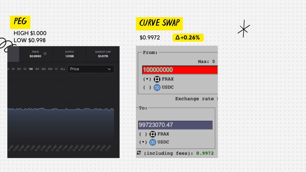 Let's begin our regular programming with the Peg.  We saw it get as low as $0.998 with a high of $1.000 for the week.  Peg Check = Strong.   We then looked at Curve via swapping 100M FRAX for USDC.  We received a 0.9972 exchange rate, which is an increase of 26 bps compared to last week’s.  The Frax team has yet to balance the pool so there’s an imbalance of like 75/25 Frax/USDC in the pool right now.  Moving on we have our Collateralization %.