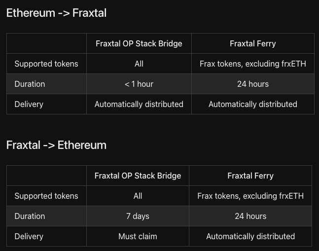 There are two primary pathways within the Fraxtal bridge: the Fraxtal OP Stack Bridge and the Fraxtal Ferry.