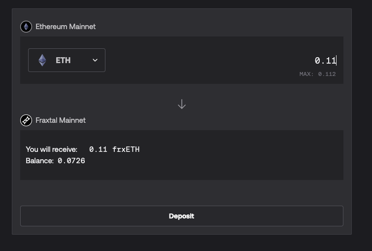 1. Select the amount of tokens that you want to send to Fraxtal. If you send ETH, it will automatically be converted into frxETH, which is the gas token for the network.