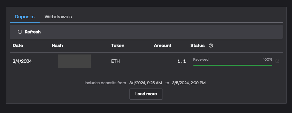 2. After you complete the transaction, you will see it show up in your deposit history. You can click on the hash to see the transaction details in Etherscan.