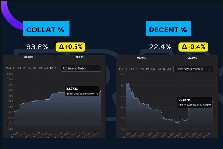 The collateralization ratio hit a new high at 93.8%.  The decentralization percentage dropped small by 40 bps to 22.4%.