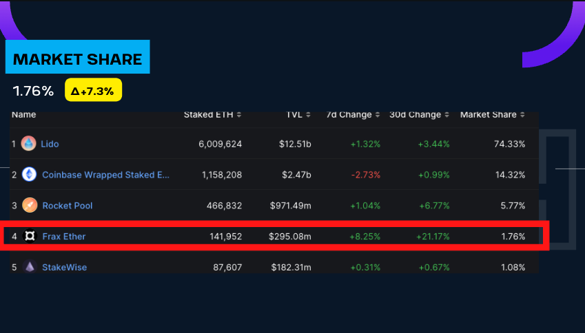 Take a look at that!  frxETH has the best 30D change.  What’s even better is that frxETH’s 7D change is better than all the other competitors’ 30D change.  frxETH saw an increase of 7% in its market share, up to 1.76%.  On the yield front, frxETH is still at the top of the charts with 5% APY this week — even after the fees, frxETH is still the top.