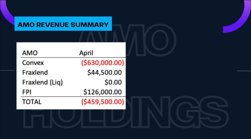 The aggregate profit for April so far is a loss of $459M.  Convex AMO racked up the largest loss so far but keep in mind that we had just paid for the Votium epoch.  On the FraxLend front, the AMO is generating about $15k per week so we’re at $45k in April.  FPI putting up great numbers at $126k profit.
