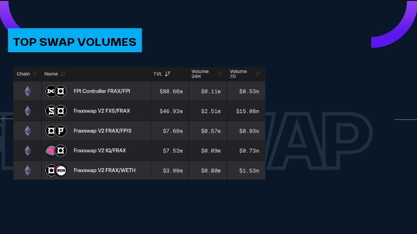The last leg of the DeFi Trinity: the FraxSwap.  We see that the TVL is inching up to the high of $72M.  On the individual pair front, we see that FRAX/FXS is still facilitating $15M per week.