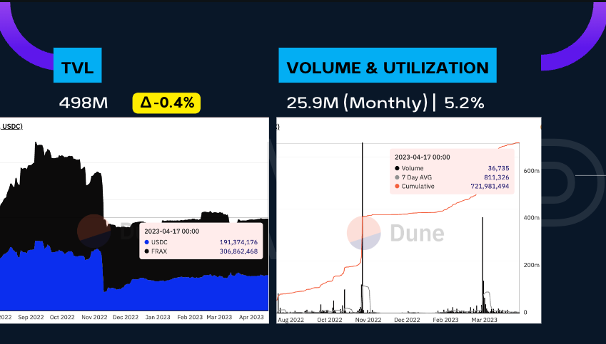FraxBP is still chilling at around $500M TVL but the monthly volume for April is markedly lower than March’s.  But overall quite good for FraxBP with steady TVL and volume going back to the norms.