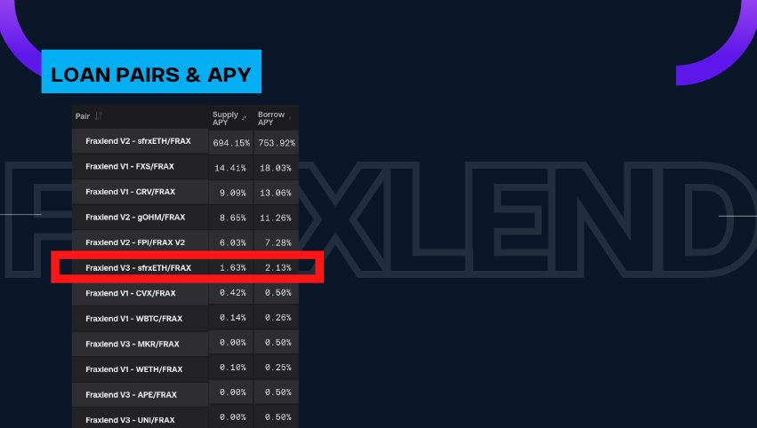 FraxLend’s supply value pretty much fully recovered from the Circle incident.  But we’re still seeing a lag in the collateral value.  Some more good news, we see that the utilization rate increased by nearly 5% this week.  Let’s take a look at the loan pairs.  The FXS/FRAX pair is printing it this week with 14% APY.  Next up, the CRV/FRAX has been printing it with a consistent 8-9% for the past few weeks now.  Also, note that the sfrxETH/FRAX pair only costs 2% APY so effectively the borrower is getting paid to borrow.