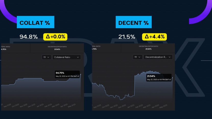 Again, very calm on this front as well. The Collateralization Percent remains at its all-time-high of 94.8%, been this way for the past 5 Frax Checks. The Decentralization Percent jumped bigly up 4.4% this week to 21.5%. We’ve been on a downtrend for nearly 8 weeks now so we’re glad to see this slight reversal.