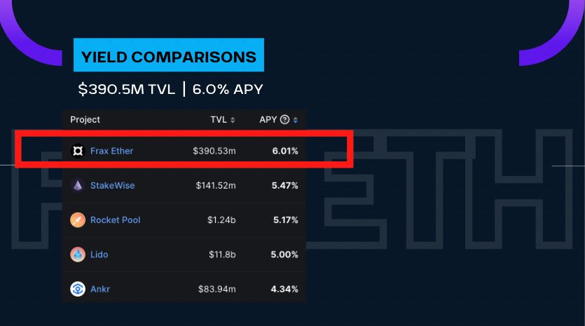 Speaking of landscape, let’s look at the LSD market. Unlike last week, we are up in our marketshare this week.  We’ve risen 13% to a 2.42% of the total ETH LSD market.  We saw strong growth over the last 30 days of 39% and our 7-day change is at 13%.  Though, we’re not alone.  Rocketpool also had a great week and month so they’re climbing strong.  Lido lead is sliding from where they started which was around the 75% mark, now down to 72.9%.  But you know the one department frxETH is dominating is in the yield arena. Here we witnessed one of the higher APY at 6% — that sweet native ETH yield.