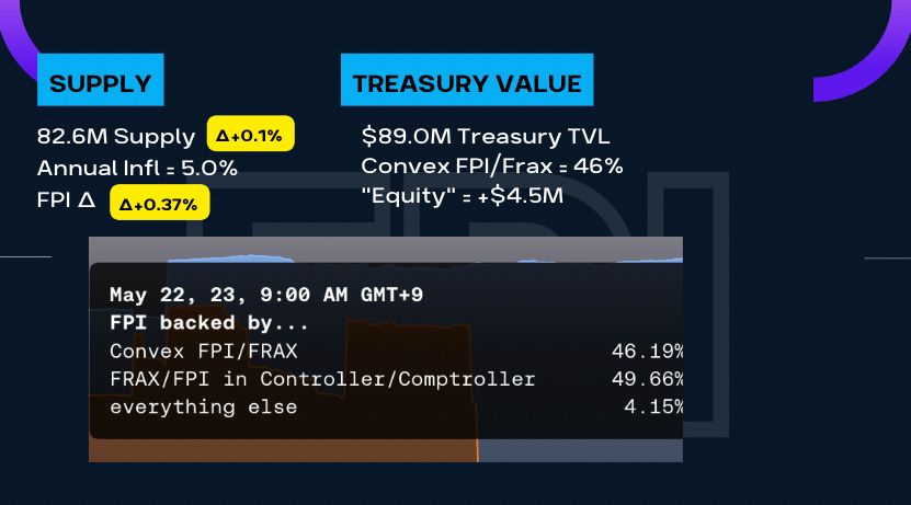 The FPI has remained quiet for some time now since the release of veFPIS. We saw the supply increase slightly by $100k, which brings it to 82.6M but note that FPI is actually above the required peg by 37 basis points. The Treasury TVL is flat this week at $89M. We like to see the Treasury TVL increasing as well as the equity value increasing.  The equity value is at $4.5M.