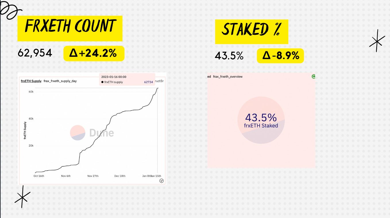 The count is at 62,954.  And look at that chart, I know you can’t read it but just appreciate the verticalness off that graph.  +24.2%.  Hot.  Last week I said the LSD narrative floating around is going to be a catalyst for more deposits and lo’ behold.  We up another casual 12k ETH  deposits.  I don’t always pat myself on the back but sorta called this one.  On the staked side we see that the staking rate dropped by 9% this week down to 43.5% from 47.8%.  The sfrxETH is earning a cool rate of 6.69% -- very nice.