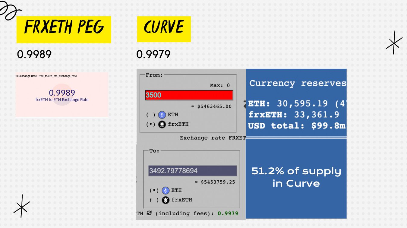Next, we have our FrxETH segment.  As always, we check the peg.  Peg check here is strong you see the price delta is only 0.0011 between frxETH and ETH – slight deviation from last week.  But, we obvs have to go into the market and check this ourselves and you see here that I tried to do a 3500 ETH swap which is roughly the amount of the largest frxETH holder and I get an exchange rate of 0.9979.  That’s not too shabby, down about 7 bps from last week.  Also, last week we had 51.2% of the frxETH staked in the Curve pool, and now we’re up small to 53.0% of the supply inside curve.  And also let’s just note the TVL in here, we’re about to break $100M.  9 FIGURES baby.  The APY as per Convex is at 6.5% projected versus 6.69% for sfrxETH.  The market here is so dam efficient, I love it.  Let’s see what the count looks like this week.