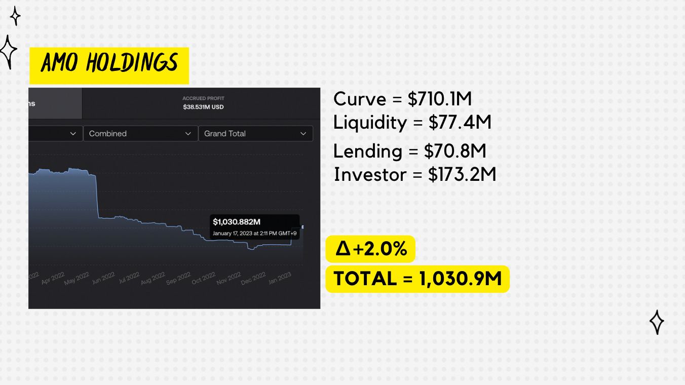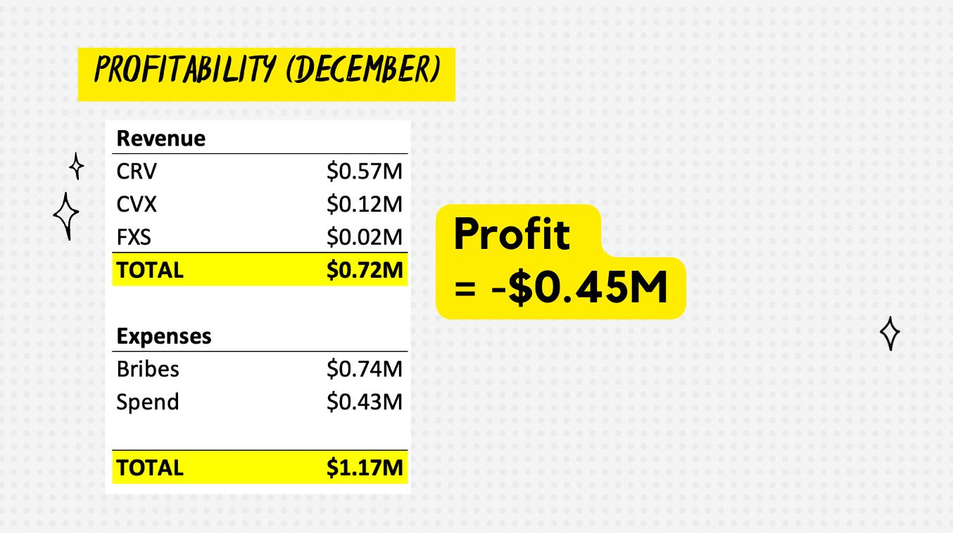 Onto the profitability of the Convex AMO.  For the month of January so far we have $720k in revenue and $1.17M in expenses.  As you can see, most of our revenue comes from CRV rewards, magnitudes larger than the CVX and FXS rewards.  With a net loss of $450k to start our 2023.  We have another bribe to pay next week and then hopefully 2 rounds of rewards so we just may end the month down small or fingers crossed, break even.