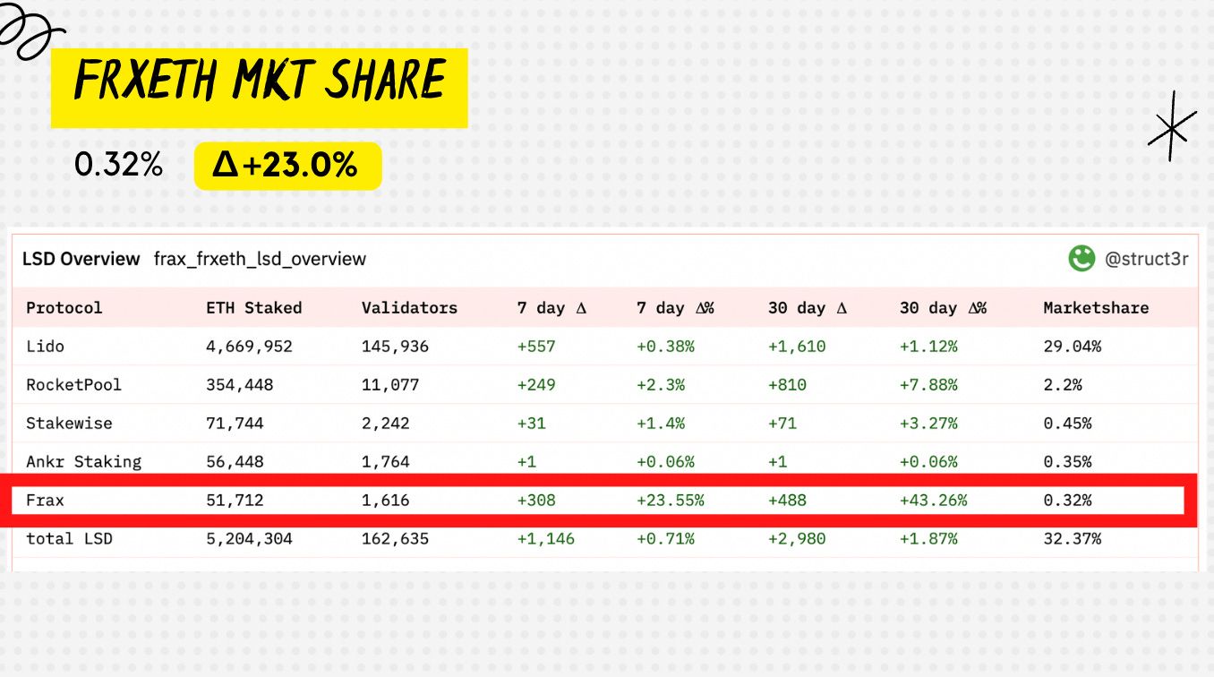 We have a new slide here where we layout the LSD market landscape.  Obvs, we have Lido in the lead with 29% of the market but you can see here that Frax REAMAINED the highest 30-day delta in the group, at +43% so far.  The massive pump deposits this week led to a 23% increase in market share for frxETH, which sits at 0.32%.  We boutta’ flip Ankr Staking fr fr.  Let’s keep fighting the good fight and pump up these rookie numbers!  Now, let’s do a quick summary check.
